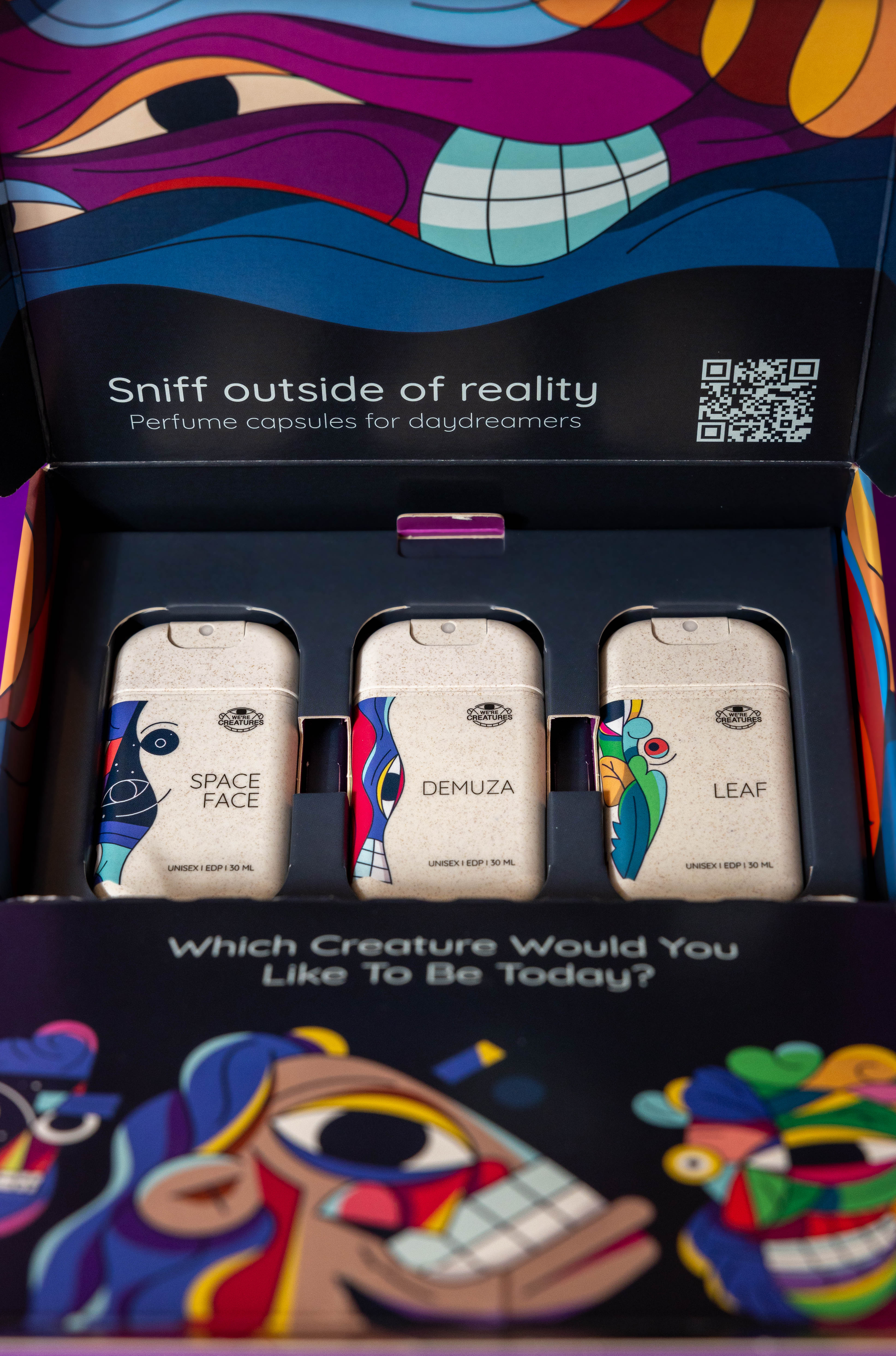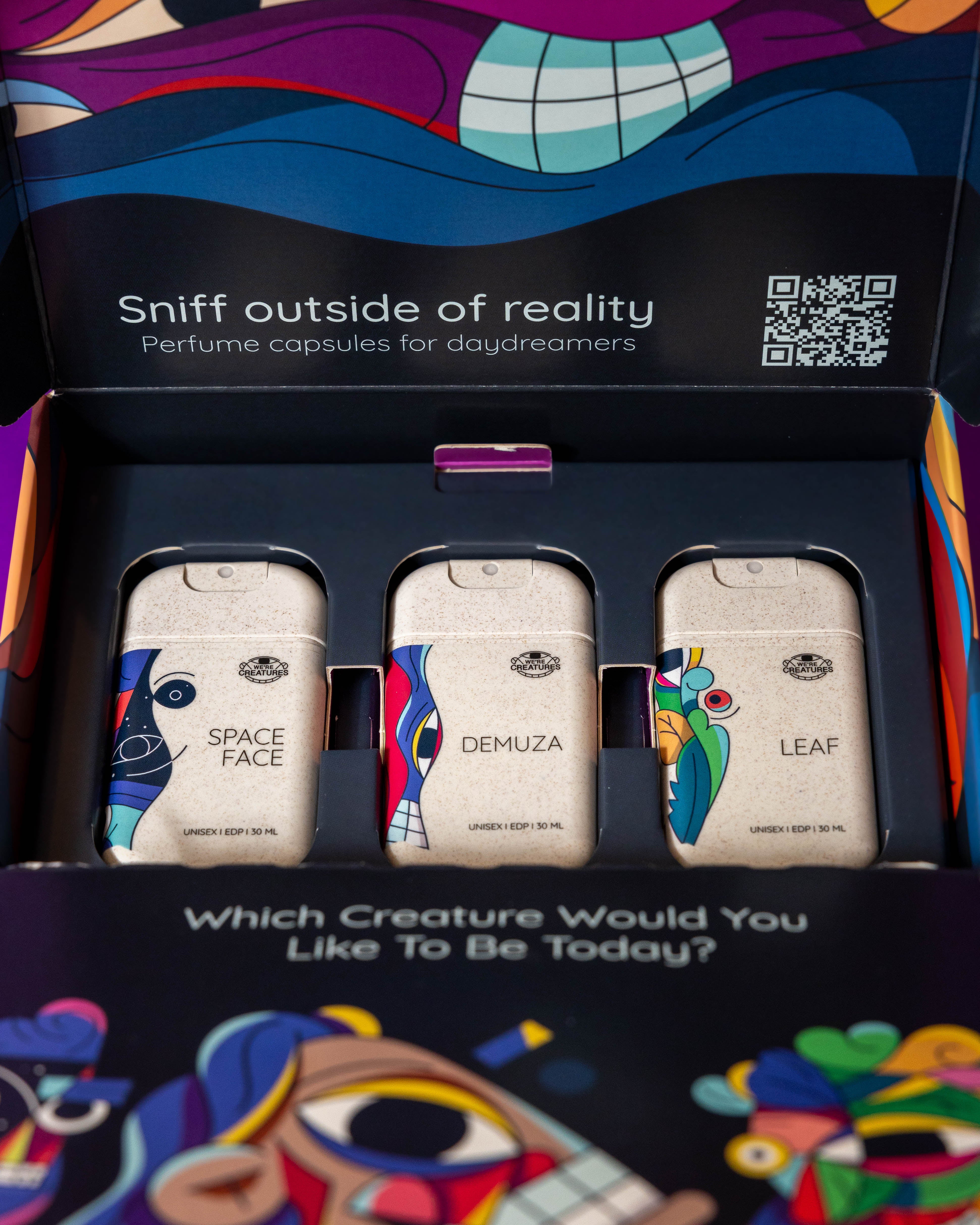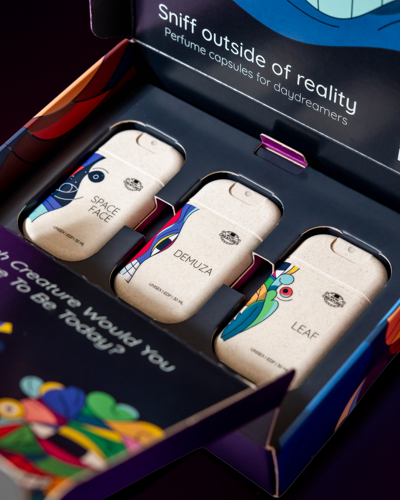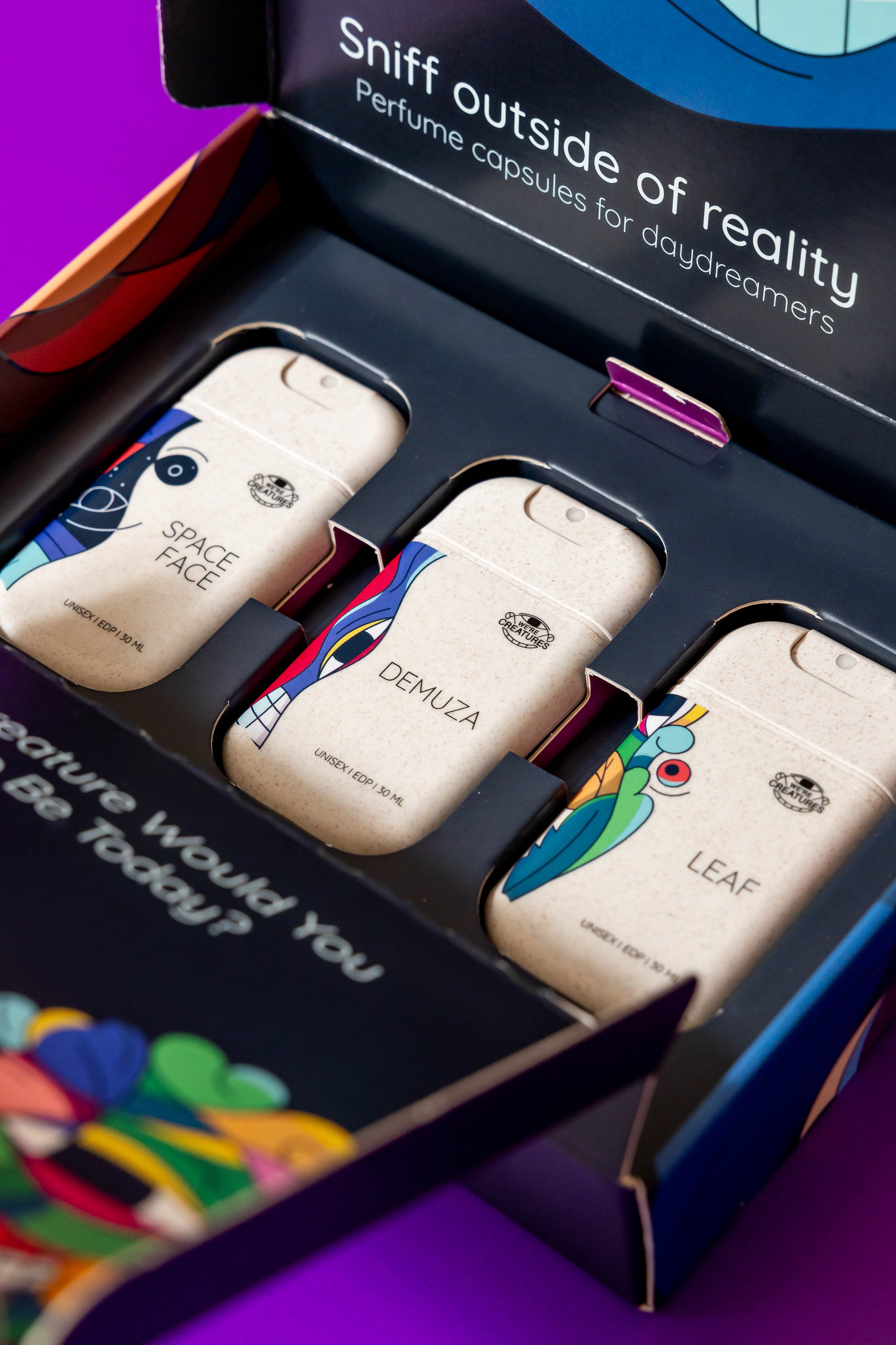 שלישיית בשמי כיס יוניסקס, בהשראת שלוש דמויות מאוירות: LEAF, DEMUZA ו-SPACE-FACE.